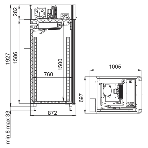 Каталог оборудования Холодильное оборудованиеШкафы холодильныеСпециализированные холодильные шкафыШкаф холодильный для вызревания салями Polair CS107 Salami со стеклом Шкаф холодильный для вызревания салями Polair CS107 Salami со стеклом Код товара: 062-631 Поделиться: WhatsAppTelegram СравнитьДобавить в КПВ избранное 0 385 050 ₽ В корзину 0 шт Под заказСамовывоз сегодня бесплатно Взять в кредит Купить в лизинг Получить консультацию в WhatsApp Описание Характеристики Отзывы 0 Инструкции 5 Шкаф холодильный для вызревания салями Polair CS107 Salami со стеклом предназначен для приготовления и хранения салями, сыровяленых колбас и других мясных деликатесов на предприятиях общественного питания и торговли. Корпус цельнозаливной конструкции выполнен из нержавеющей стали снаружи и внутри (кроме задней стенки), что обеспечивает высокую прочность и долговечность. Дверь выполнена в виде стеклопакета для удобного визуального контроля. Оборудование рассчитано на работу при температуре окружающей среды до +40 °С. Особенности: Динамическое охлаждение с мягким обдувом без заветривания Верхнее расположение агрегата Автоматическая оттайка с системой испарения конденсата Русифицированная многофункциональная панель управления с дисплеем 5" и возможностью создания и сохранения собственных программ Встроенный ультразвуковой увлажнитель (необходима подача очищенной воды и подключение к канализации) UV-лампа для обеззараживания воздуха внутри камеры 3 пары направляющих с тремя перекладинами и подвесами для колбас Регулируемый уровень влажности: от 60 до 95 % Распашная дверь с заливной теплоизоляцией, встроенной ручкой и магнитным уплотнителем Отключаемая внутренняя LED-подсветка Штампованное углубление в дне корпуса для удобства ухода Педаль для удобного открытия двери Хладагент R290 (пропан) Толщина стенки корпуса: 43 мм Polair CS107 Salami со стеклом — это профессиональный шкаф, разработанный специально для мясных деликатесов. Он обеспечивает оптимальные условия для ферментации и хранения продукции за счёт точного контроля температуры и влажности, продуманной конструкции и удобного функционала. Такой шкаф станет надёжным решением для мясных цехов, гастробаров и специализированных магазинов.Изображение товара, представленного на фото, может отличаться от его фактического вида. Показать все Габаритные размеры697×1005×1960 ммДиапазон рабочей температурыот -2 до +30 °CДлина697 ммШирина1005 ммВысота1960 ммОбъём700 лКол-во дверей1 Тип двериСтеклянная Уровень влажностиот 60 до 95 %Холодильный агрегатВстроенный Тип оттайкиАвтоматическая Тип охлажденияДинамическое ПодсветкаЕсть UV-лампаЕсть ХладагентR290 Вес нетто160 кгВес брутто190 кгБрендPolairВсе специализированные холодильные шкафы Из нержавейкиВсе специализированные холодильные шкафы Стеклянная дверь Оставить отзыв Еще никто не оставил отзыв на этот товар Схема POLAIR CS107 Salami.jpgИнструкция на POLAIR CS107 Salami.pdfБрошюра на POLAIR CS107 Salami.pdfДекларация о соответствии.pdfСертификат соответствия.pdf Похожие товары Перейти в каталог В наличии 405 365 ₽ Шкаф холодильный для хлебопекарных производств Polair CS107 Bakery Br черный, со стеклом (Тип 2) Под заказ 392 700 ₽ Шкаф холодильный для вызревания мяса Polair CS107 Meat черный, со стеклом (Тип 2) Под заказ 397 800 ₽ Шкаф холодильный для вызревания сыра Polair CS107 Cheese полки нерж., со стеклом Под заказ 385 475 ₽ Шкаф холодильный для вызревания сыр