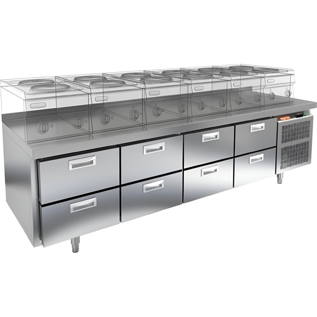 Каталог оборудования Холодильное оборудованиеСтолы охлаждаемыеСтолы холодильные под тепловое оборудованиеСтол охлаждаемый HiCold GN 2222/TN LT под тепловое оборудование Стол охлаждаемый HiCold GN 2222/TN LT под тепловое оборудование Код товара: 065-431 Поделиться: WhatsAppTelegram СравнитьДобавить в КПВ избранное 0 283 402 ₽ В корзину 0 шт Под заказСамовывоз сегодня бесплатно Взять в кредит Купить в лизинг Получить консультацию в WhatsApp Описание Характеристики Отзывы 0 Инструкции 2 Стол охлаждаемый HiCold GN 2222/TN LT под тепловое оборудование — это профессиональное оборудование, предназначенное для кратковременного хранения скоропортящихся продуктов и напитков, а также удобной подготовки ингредиентов на предприятиях общественного питания и торговли. Модель сочетает функциональность, надежность и эргономичный дизайн. Столешница рассчитана на установку теплового оборудования: под рабочей поверхностью встроен ДСП-лист, который укрепляет конструкцию и препятствует проникновению тепла внутрь. Такое решение обеспечивает дополнительную жесткость, позволяет рационально использовать рабочее пространство и повышает эффективность работы на кухне. Ключевые особенности: 8 выдвижных ящиков обеспечивают удобный доступ к продуктам и рациональную организацию пространства. Электронная панель управления — простое и точное регулирование температуры. Автоматические доводчики дверей с фиксатором в открытом положении — для комфорта при загрузке и выгрузке. Легкозаменяемые магнитные уплотнители обеспечивают надежную герметичность. Регулируемые по высоте ножки позволяют адаптировать стол к любому рабочему пространству. Корпус и столешница из нержавеющей стали — долговечность, устойчивость к коррозии и простота в уходе. Толщина теплоизоляции, столешницы и борта — 50 мм — оптимальное сохранение температуры и жесткость конструкции. Рабочий температурный режим при температуре окружающей среды от 12 до 37 °C. HiCold GN 2222/TN LT — это многофункциональный холодильный стол, идеально подходящий для профессиональной кухни. Он сочетает в себе высокое качество материалов, продуманную конструкцию и удобство эксплуатации, что делает его надежным помощником в интенсивной повседневной работе.Изображение товара, представленного на фото, может отличаться от его фактического вида. Показать все Габаритные размеры2280×700×675 ммДиапазон рабочей температурыот -2 до +10 °CМатериал столешницыНержавеющая Расположение агрегатаБоковое Объём495 лТип столаС ящиками Напряжение220 ВМощность0,48 кВтТип охлажденияДинамический Тип оттайкиАвтоматическая СтолешницаС бортом Габариты в упаковке2440×850×850 ммВес нетто140 кгВес брутто180 кгБрендHicold Оставить отзыв Еще никто не оставил отзыв на этот товар Паспорт на HICOLD GN 2222TN LT.pdfДекларация о соответствии.pdf Похожие товары Перейти в каталог Под заказ 148 851 ₽ Стол холодильный среднетемпературный HiCold SN 1111/TN W В наличии 124 828 ₽ Стол холодильный среднетемпературный Polair TM4GN-GС С этим товаром покупают В наличии 178 679 ₽ Шкаф холодильный универсальный Polair CV 114-G В наличии 9 842 ₽ Индукционная плита HURAKAN HKN-ICW35ML WOK Ранее просмотрено Под заказ 347 526 ₽ Компрессорно-конденсаторный блок Intercold CCB335 YM115 Под заказ 133 110 ₽ Витрина холодильная Carboma GС95 ВХСн-1,8 (GС95 SL 1,8-1) Под заказ 303 273 ₽ Компрессорно-конденсаторный блок Север AHM-ZF09 6-ти полюсной вентилятор Под заказ 159 840 ₽ Витрина холодильн