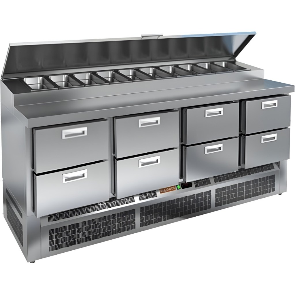 Каталог оборудования Холодильное оборудованиеСтолы охлаждаемыеСтолы холодильные для пиццыСтол холодильный для пиццы HiCold PZE1-2222GN (1/3) Стол холодильный для пиццы HiCold PZE1-2222GN (1/3) Код товара: 064-726 Поделиться: WhatsAppTelegram СравнитьДобавить в КПВ избранное 0 342 622 ₽ В корзину 0 шт Под заказСамовывоз сегодня бесплатно Взять в кредит Купить в лизинг Получить консультацию в WhatsApp Описание Характеристики Отзывы 0 Стол холодильный для пиццы HiCold PZE1-2222GN (1/3) — профессиональное оборудование для предприятий общественного питания и торговли. Он предназначен для раскатки теста и подготовки ингредиентов, используемых при приготовлении пиццы, салатов и других блюд, а также для охлаждения и кратковременного хранения скоропортящихся продуктов и напитков. Совмещение рабочей поверхности и охлаждаемого блока значительно упрощает работу повара — все необходимые компоненты находятся под рукой. Корпус и столешница выполнены из нержавеющей стали, обеспечивая долговечность, устойчивость к повреждениям и лёгкость ухода. Основные особенности: Динамическая система охлаждения — равномерное распределение холода по всему объёму Автоматическая оттайка — стабильная работа без образования наледи Электронная панель управления — точная настройка температуры 8 выдвижных ящика — удобная организация внутреннего пространства Автоматические доводчики ящиков — комфорт при работе Легкозаменяемые магнитные уплотнители — поддержание герметичности Открытая агрегатная часть — лёгкий доступ к техническим элементам Регулируемые по высоте ножки — установка на неровных поверхностях Максимальная глубина гастроёмкостей: 100 мм Глубина рабочей поверхности: 324 мм Толщина столешницы: 50 мм Толщина теплоизоляции: 50 мм Вместимость салат-бара: до 5 гастроёмкостей HiCold PZE1-2222GN (1/3) с четырьмя выдвижными ящиками — надёжный и функциональный холодильный стол для пиццы и салатов. Продуманная организация хранения и удобство эксплуатации обеспечивают быстрый доступ к ингредиентам и повышают производительность на профессиональной кухне.Изображение товара, представленного на фото, может отличаться от его фактического вида. Показать все Габаритные размеры1970×700×990 ммДиапазон рабочей температурыот +2 до +10 °CРасположение агрегатаНижнее Материал столешницыНержавеющая Тип столаС ящиками Объём505 лТип гастроемкостейGN 1/3 Количество ящиков8 штНапряжение220 ВМощность0,46 кВтТип охлажденияДинамическое Тип оттайкиАвтоматическая Габариты в упаковке2070×800×1260 ммВес нетто168 кгВес брутто227 кгБрендHicoldВсе холодильные столы для пиццы HicoldВсе нержавеющие холодильные столы для пиццы Оставить отзыв Еще никто не оставил отзыв на этот товар Ранее просмотрено Под заказ 206 541 ₽ Стол холодильный для пиццы HiCold PZ1-11GN (1/3) М